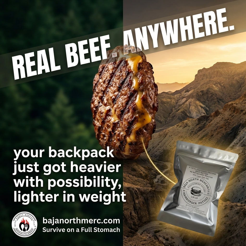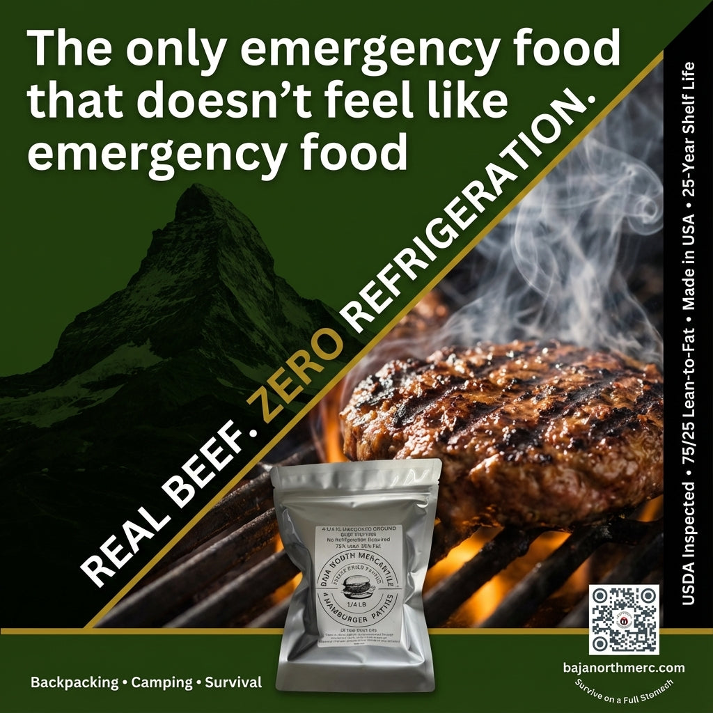 Four 1/4 lbs Raw Freeze-Dried 75/25 USDA inspected Ground Beef Patties. 1 lbs. total when Rehydrated. Designed for Backpackers, Campers, Survivalist, Hunters and Emergency Preparedness. MADE IN USA. Vacuumed Packed. No refrigeration Required.