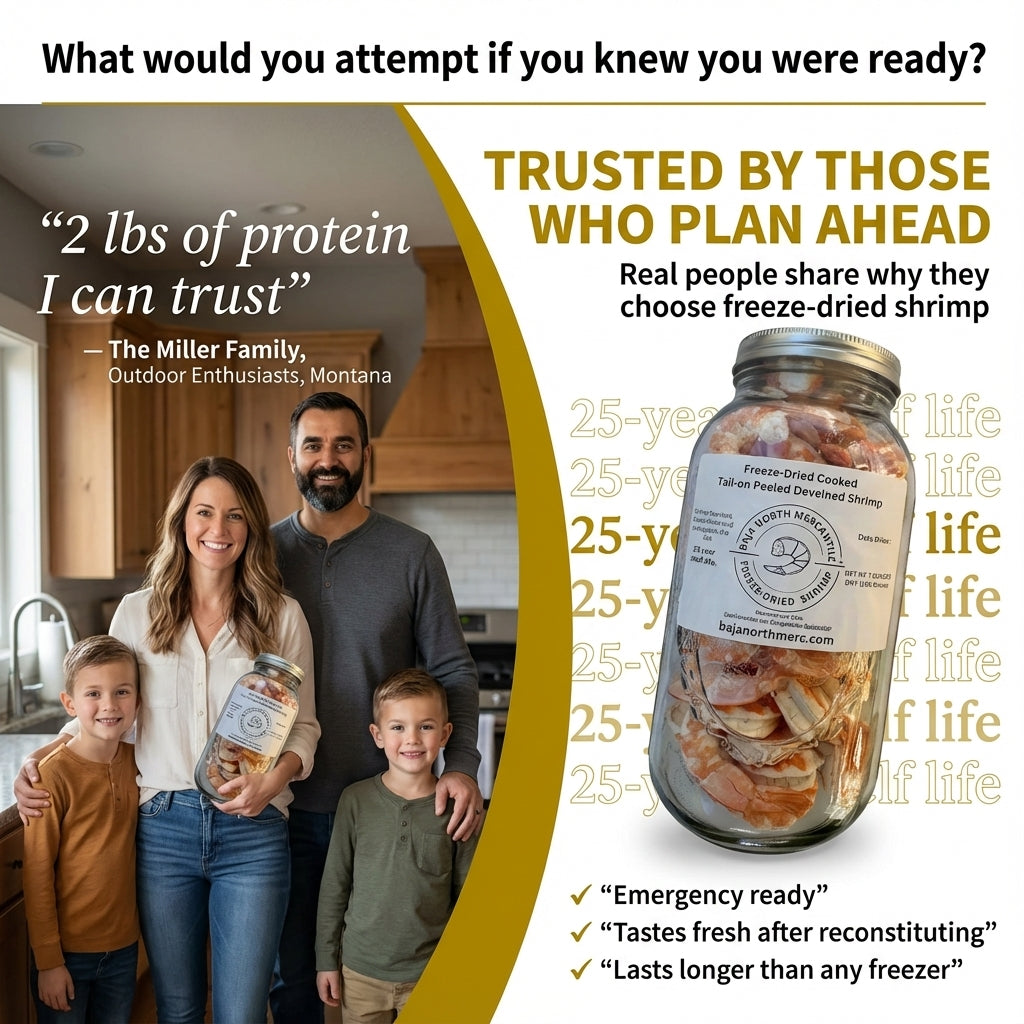 Enjoy delicious, ready-to-eat shrimp anytime with our Freeze-Dried Cooked Shrimp. Perfect for camping or emergency preparation, this vacuum-sealed jar has a 25 year shelf-life. With 31-40 shrimp per pound. 200 grams of dried shrimp equals two pounds when rehydrated. it's a convenient and tasty addition to your pantry, Camp Kitchen or Emergency Preps.