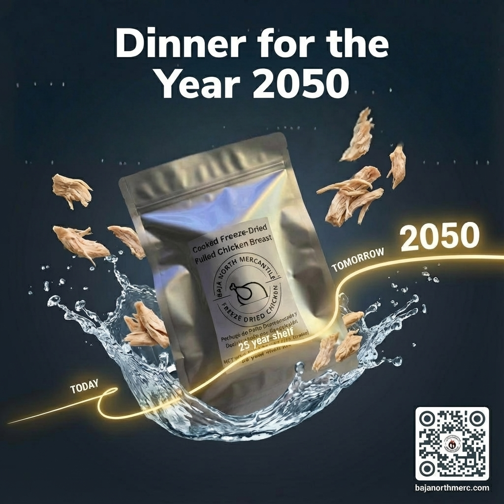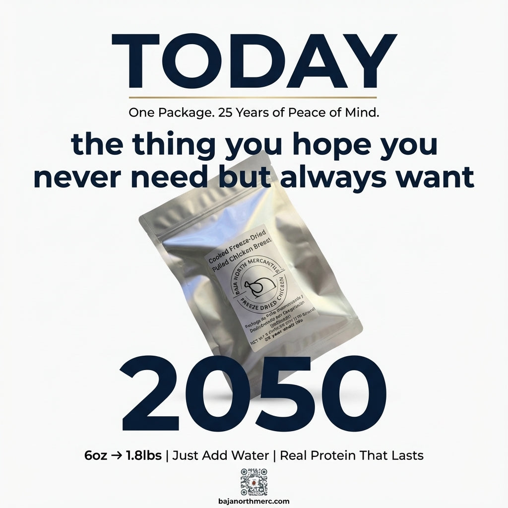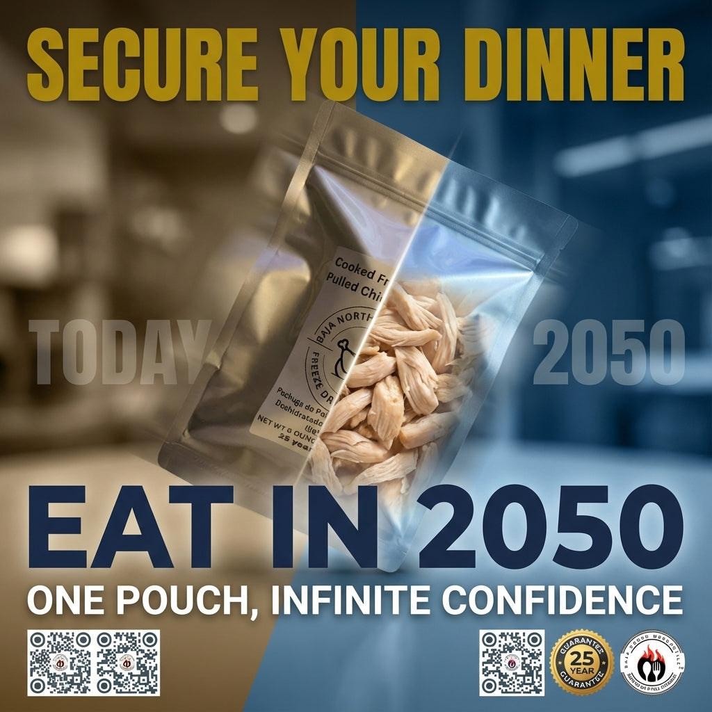 Pulled Bonesless/Skinless Chicken Breast 6oz makes 1.8lbs hydrated 25 year shelf life. Designed for Backpackers and Emergency Preparedness
